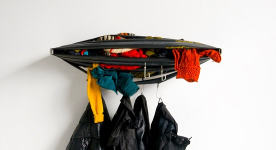 Stare gume od bicikla omotane oko dva držača služe kao spremište za kape, šalove i kapute