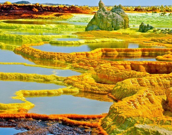 Dallol u Etiopiji je poznat po svojim izuzetnim hidrotermalnim depozitima koji pokazuju različite egzotične boje.