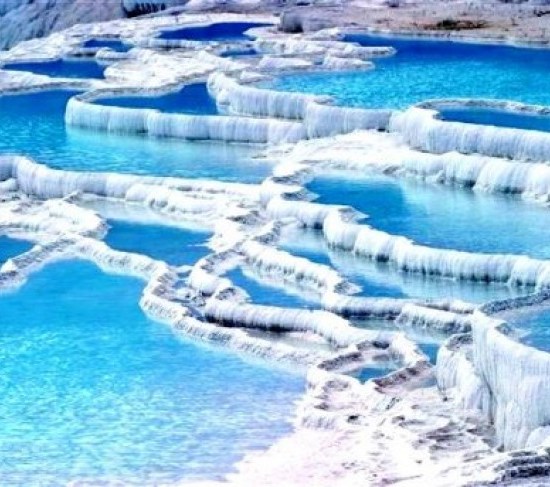 Pamukkale je kompleks jedinstvenih mineralnih izvora u jugozapadnoj Turskoj, a lokalitet se sastoji od toplih izvora i vapnenca travertina koji ima neobičan oblik plitkih terasastih bazena, nastalih prelijevanjem mineralne vode i taloženjem minerala.