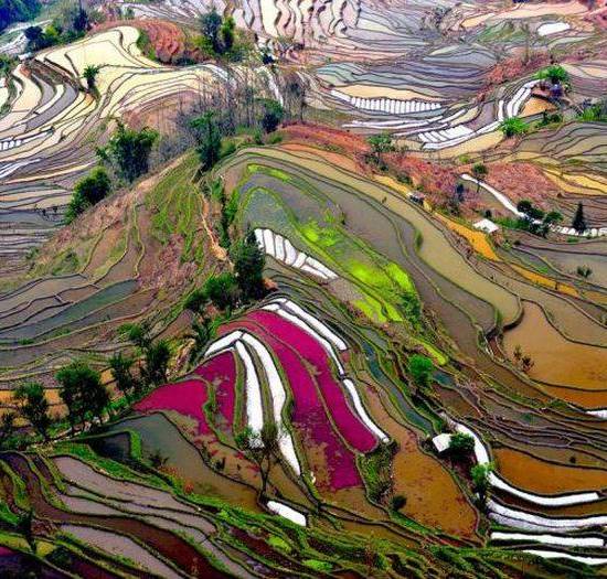 Terasasta polja u Kini stvaraju nepredvidljiv niz slojevitih boja ali i opskrbljuju rižom milijune stanovnika Kine.
