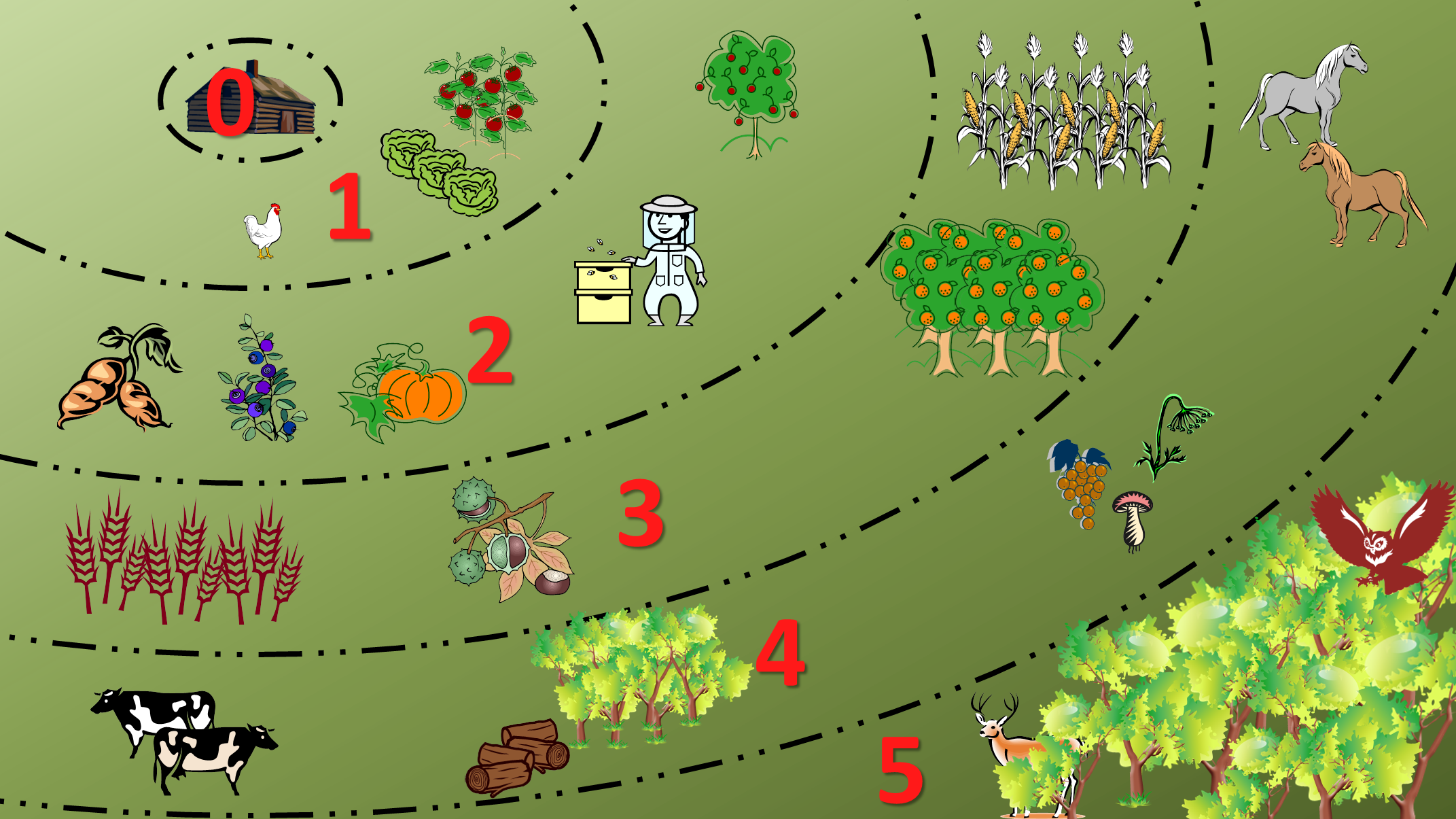 Zone su način organiziranja elementa dizajna u ljudskom okolišu na temelju učestalosti ljudske uporabe i biljnih ili životinjskih potreba. Ono što često koristimo nalazit će se u zoni blizu kuće, dok su dijelovi koji imaju koristi od izolacije, poput nekih divljih vrsta, biti najudaljeniji od kuće. Područje se dijeli na pet zona: zona 0 je centar, kuća i tu se bavimo obnovljivim izvorima energije, stvarajući skladni održivi prostor u kojem živimo i radimo. Zona 1 namjenjena je elementima i aktivnostima kojima se često koristimo ili koji zahtjevaju našu redovitu pažnju poput salata ili bobičastog voća, zatim je to mjesto za rasađivanje, za staklenike ili povišene gredice. Zona 2 je namjenjena za višegodišnje biljke koje ne zahtijevaju česta održavanja, dobro je mjesto za košnice ili veće komposte. Zona 3 služi za uzgoj glavnih usjeva za osobnu korist ili za prodaju, te ti usjevi nakon malčiranja ne zahtjevaju veće obrade. Zona 4 je polu divlje područje koje nam koristi za prikupljanje krmiva (pašnjaci), divlje hrane kao i za prikupljanje drva. Zona 5 je divlje područje u koje odlazimo učiti i promatrati.