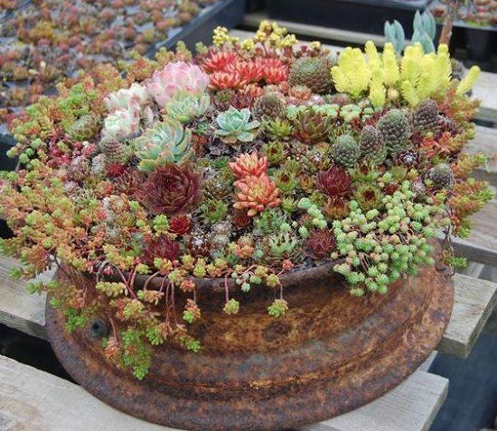 Sukulenti posađeni u staroj felgi
