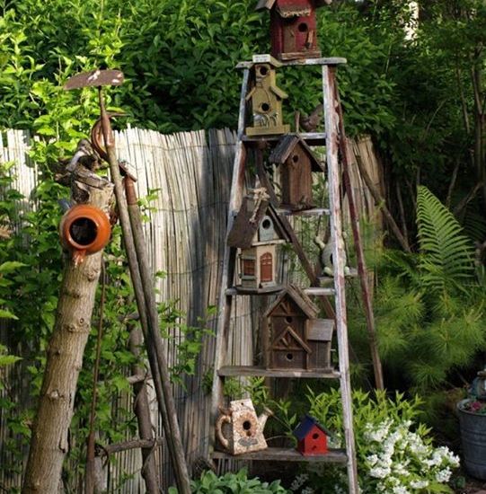 Razne kućice za ptice na starim ljestvama – dekorativno i korisno