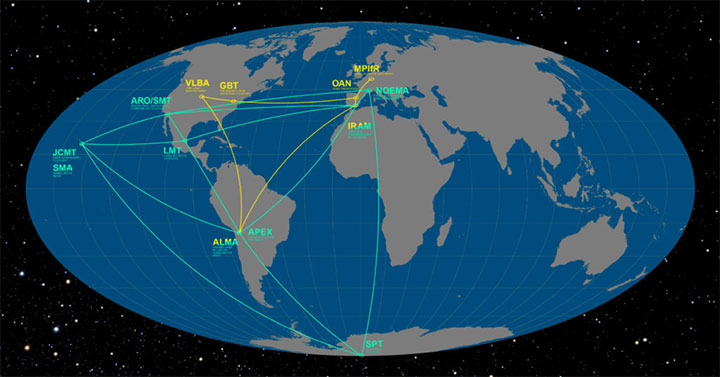 U slučaju projekta „Horizont događaja“ (Event Horizon) astronomi su koristili radio teleskope na osam međusobno udaljenih lokacija.